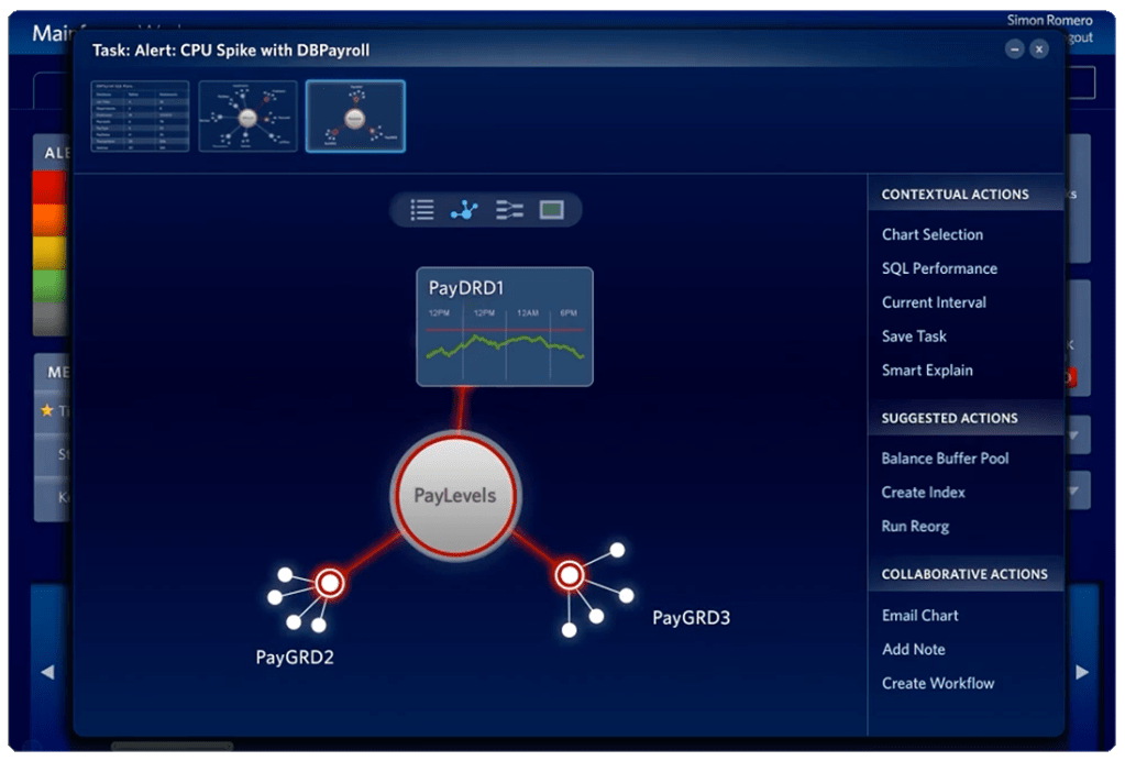A focused, contextual tool for drilling into problems. When a DBA received an alert or picked up a task, they could drag it into the Investigator, which would surface expanded context like suggested workflows, performance snapshots, links to related objects, and even the names of team members with relevant expertise. The Investigator provided multiple view modes (chart, tabular, tree, and a visual object-relationship browser) so DBAs could approach a problem from whatever angle made sense. It also maintained the classic “green-screen” view as a first-class option, respecting the mental models of experienced users rather than forcing them into an unfamiliar paradigm.