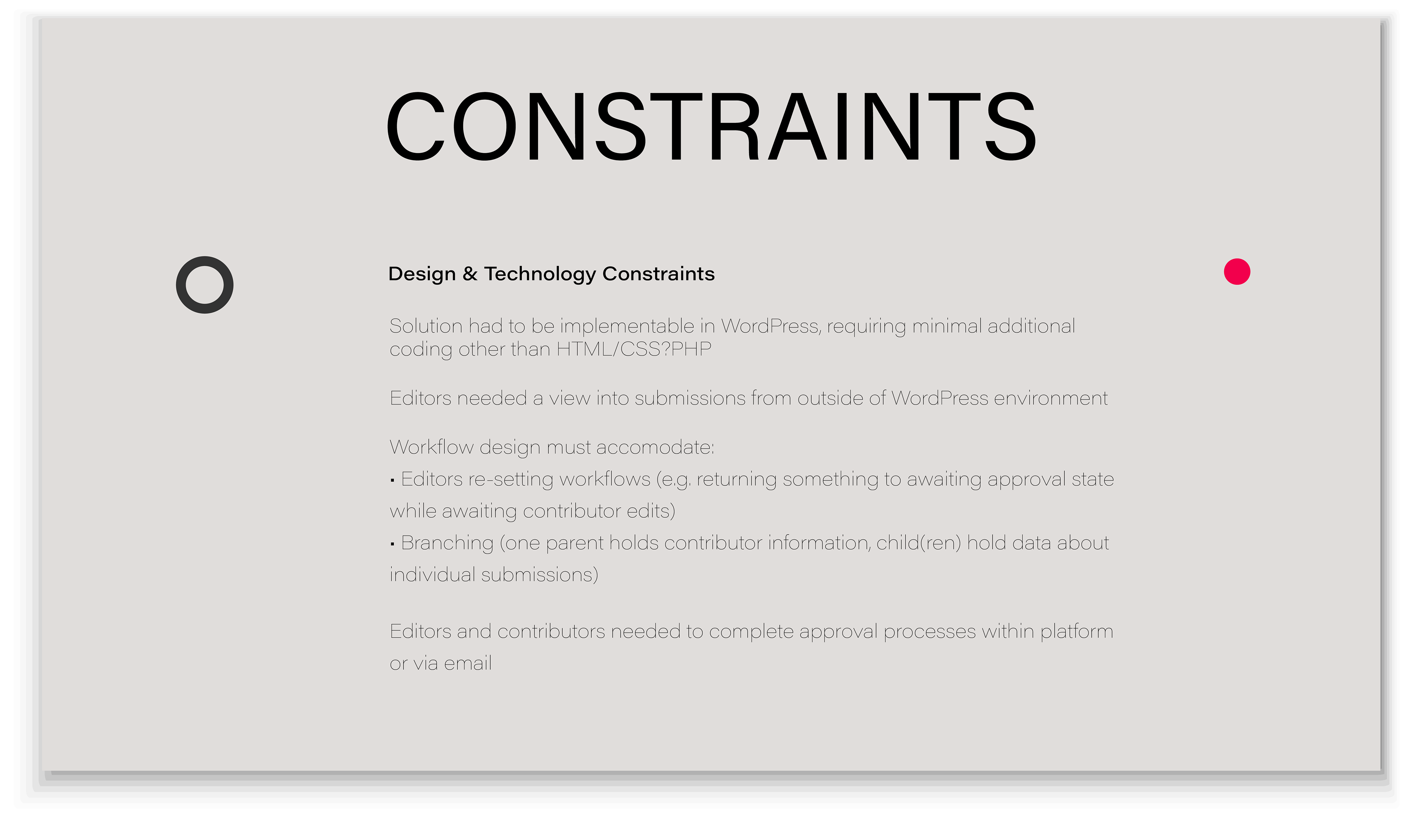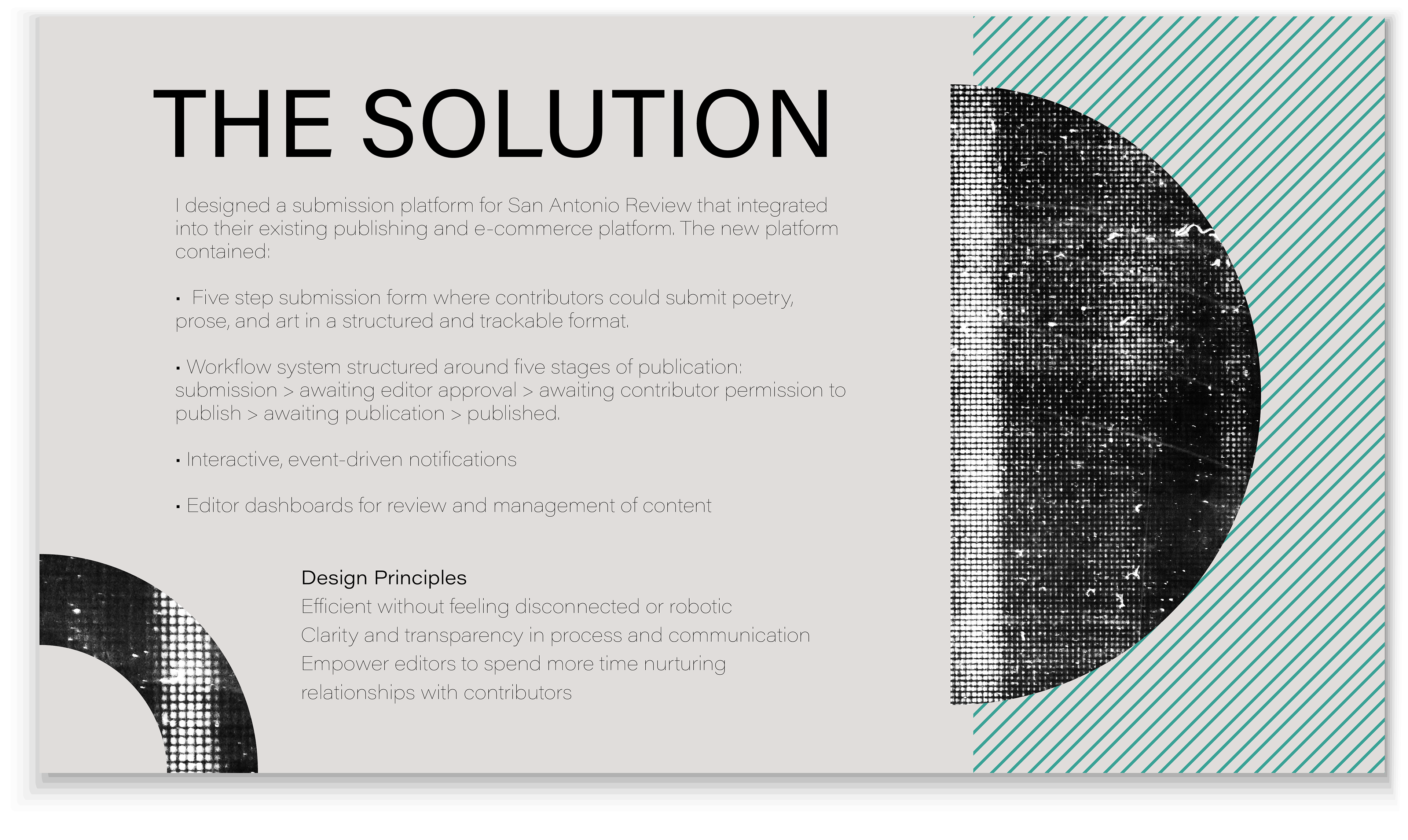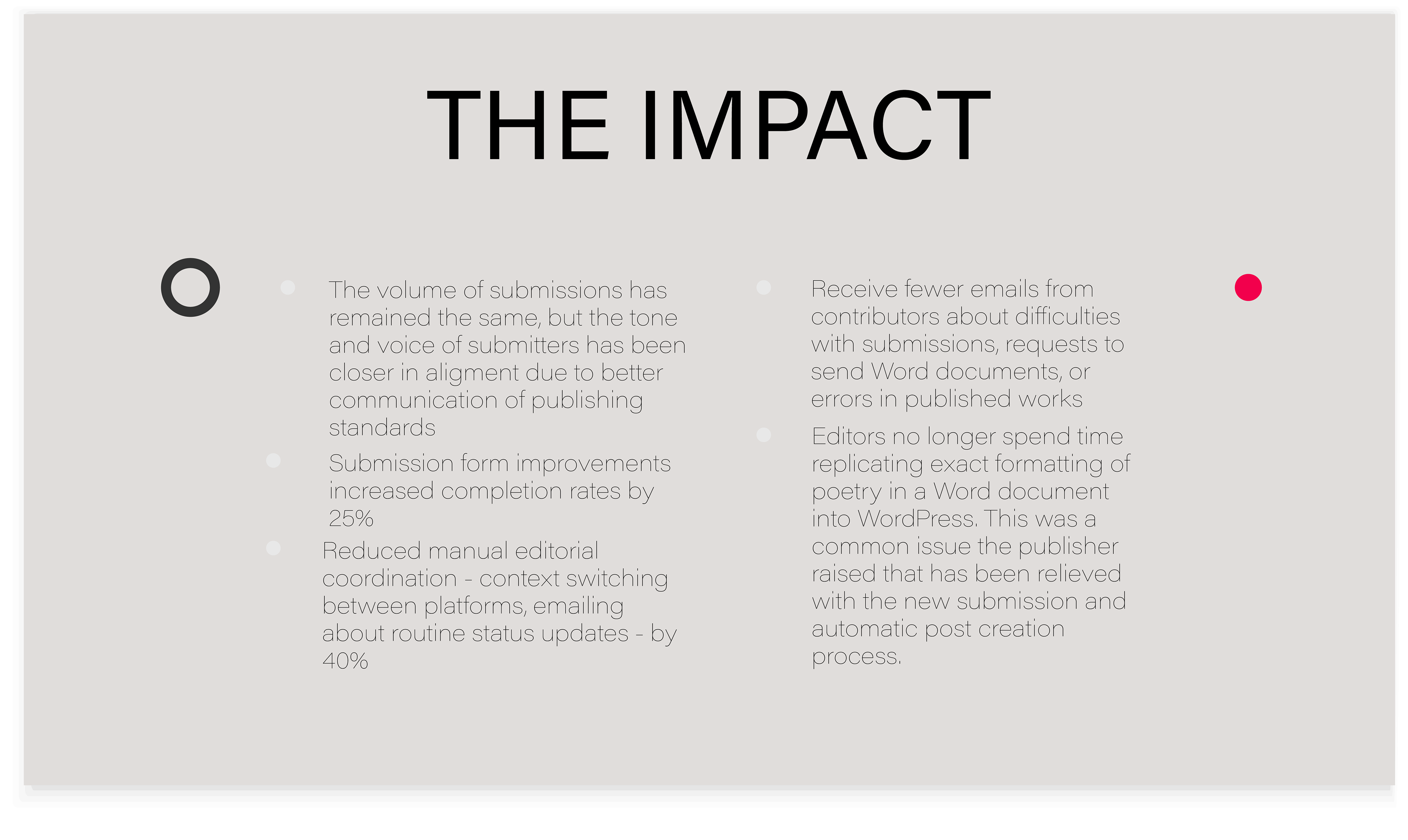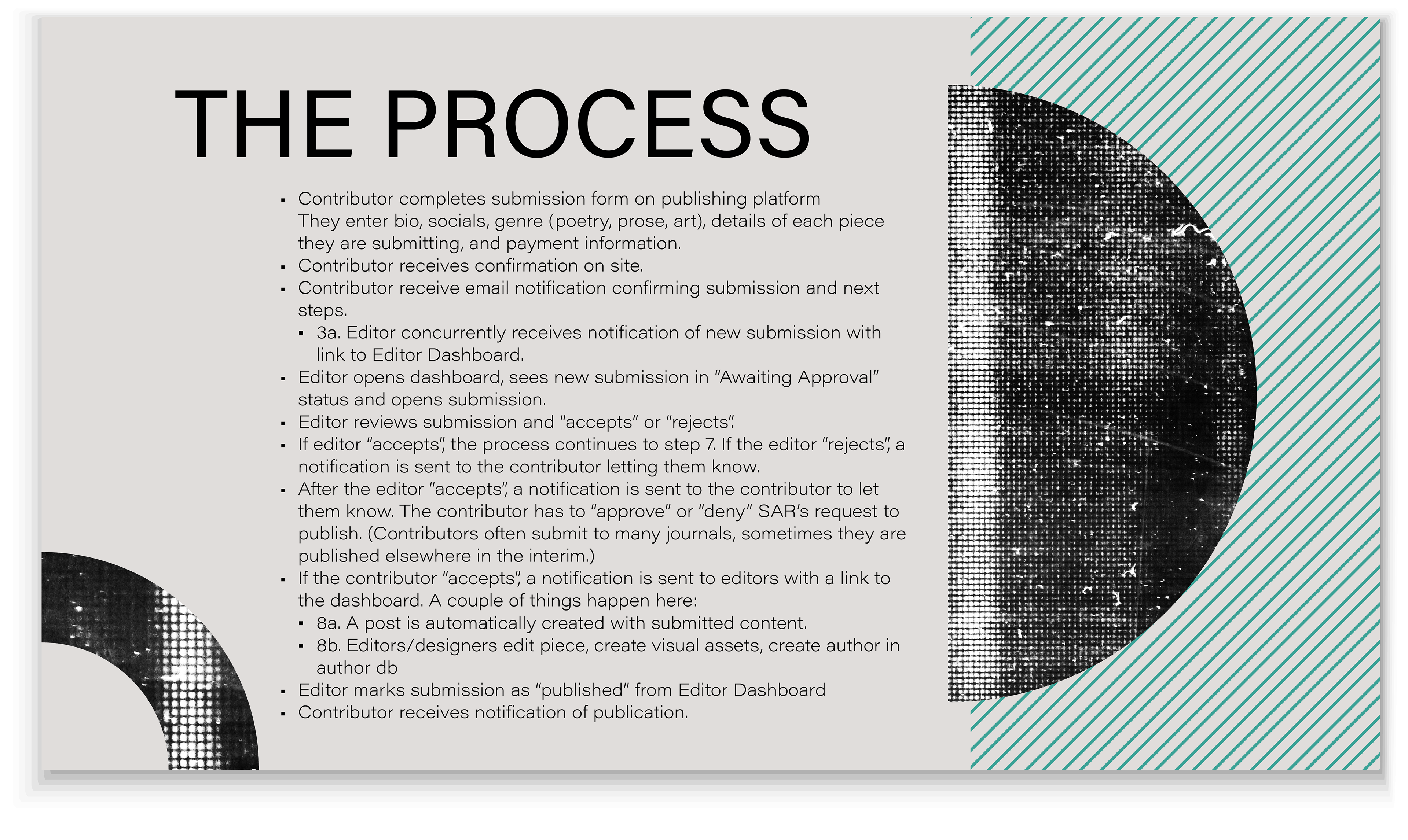 This really helped to clarify what to nail down in the design: make sure contributors knew whether their work would fit before they started, make the submission process clear, and provide continuing communication.
