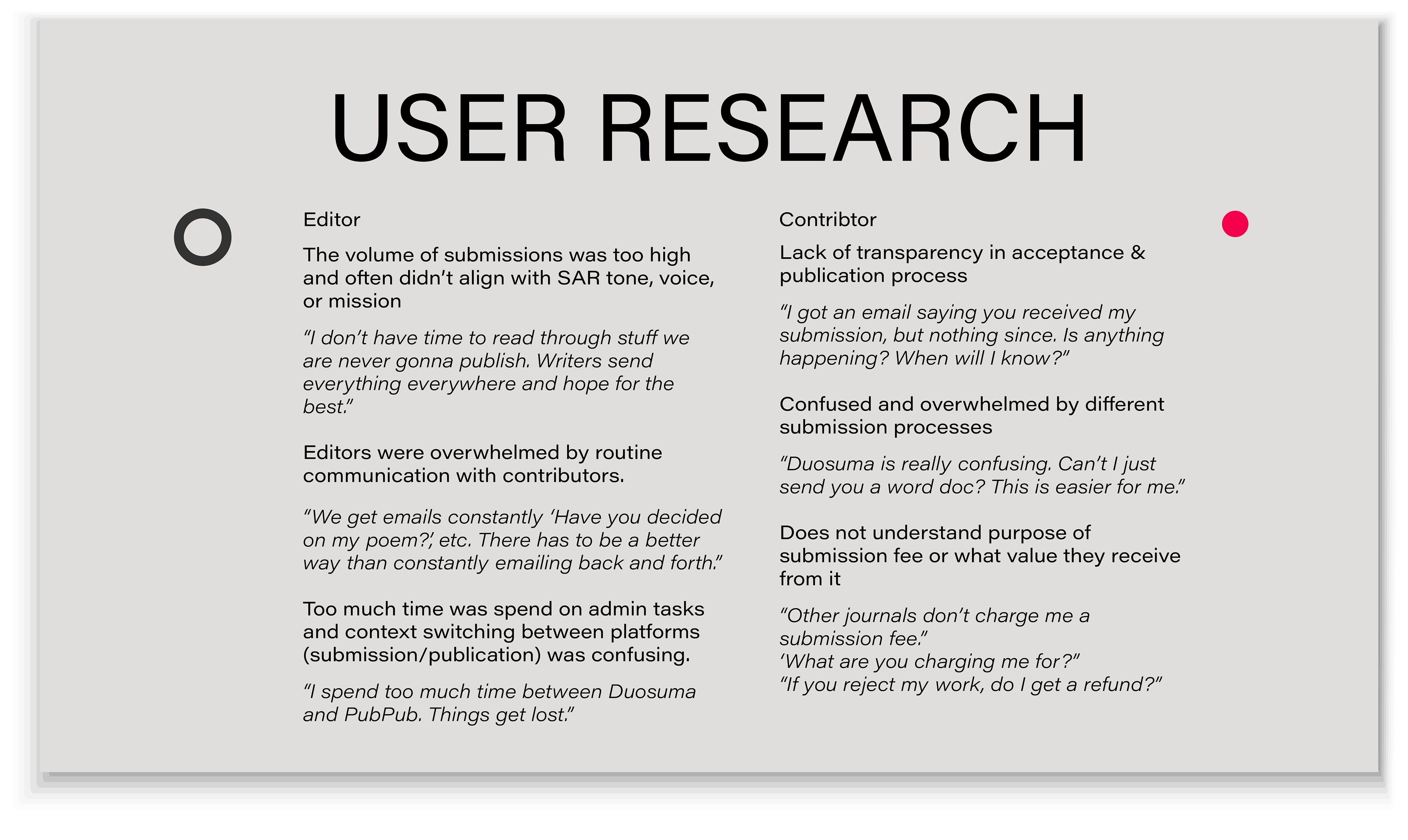SAR's contributors are highly educated, previously published authors, but are often frustrated and anxious about the submission process and guidelines due to lack of standardization across publishers and a lack of transparency into the process.