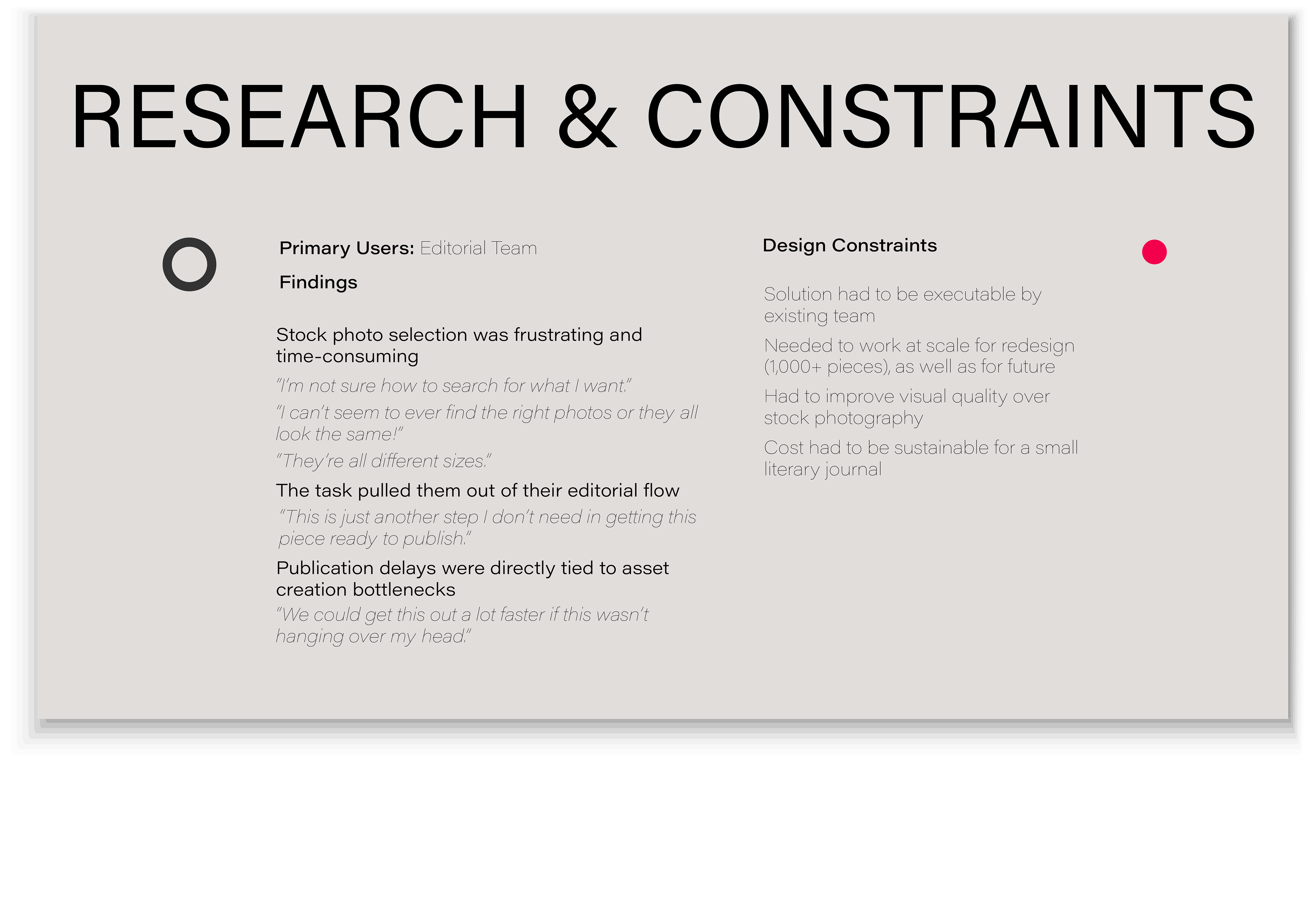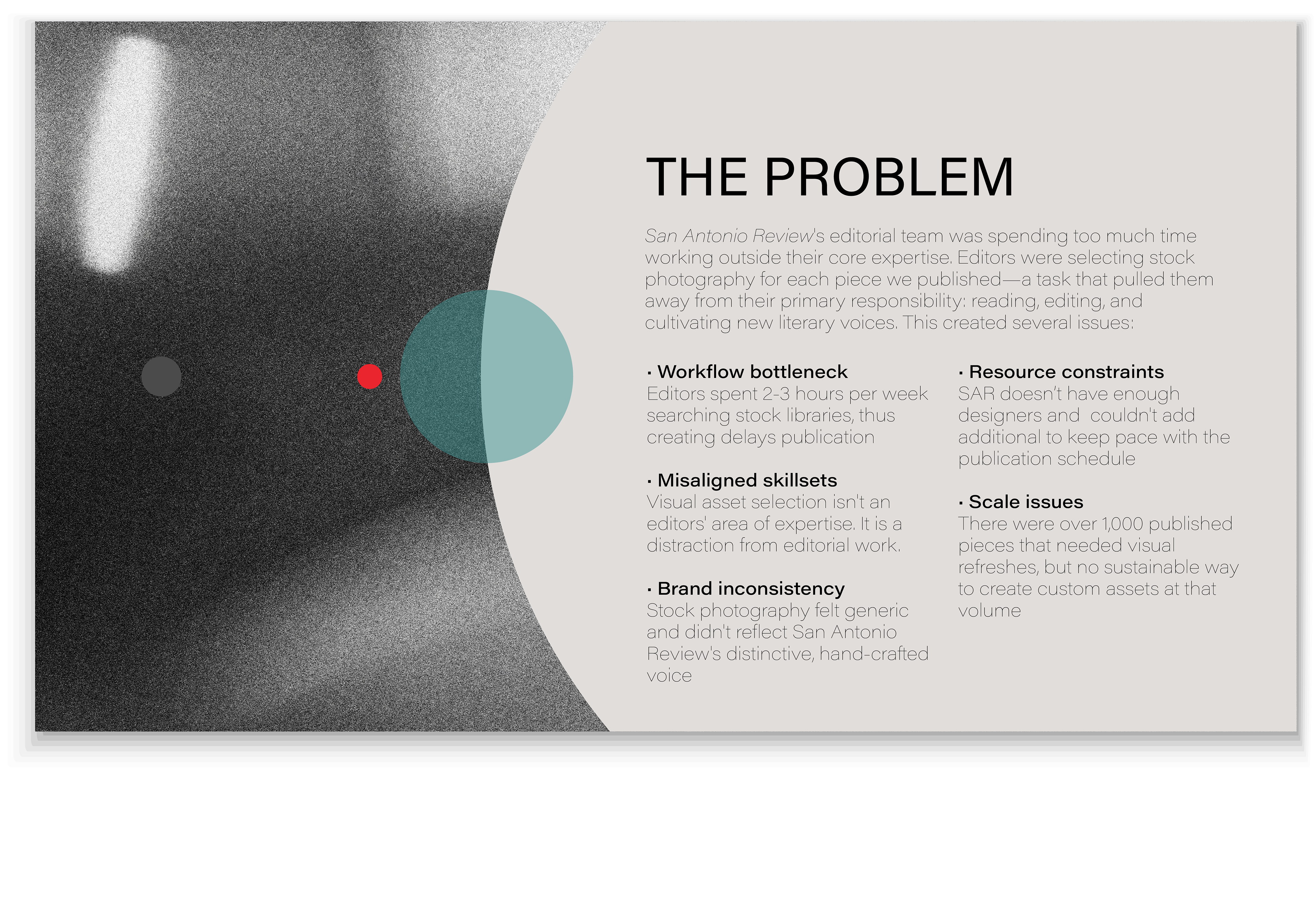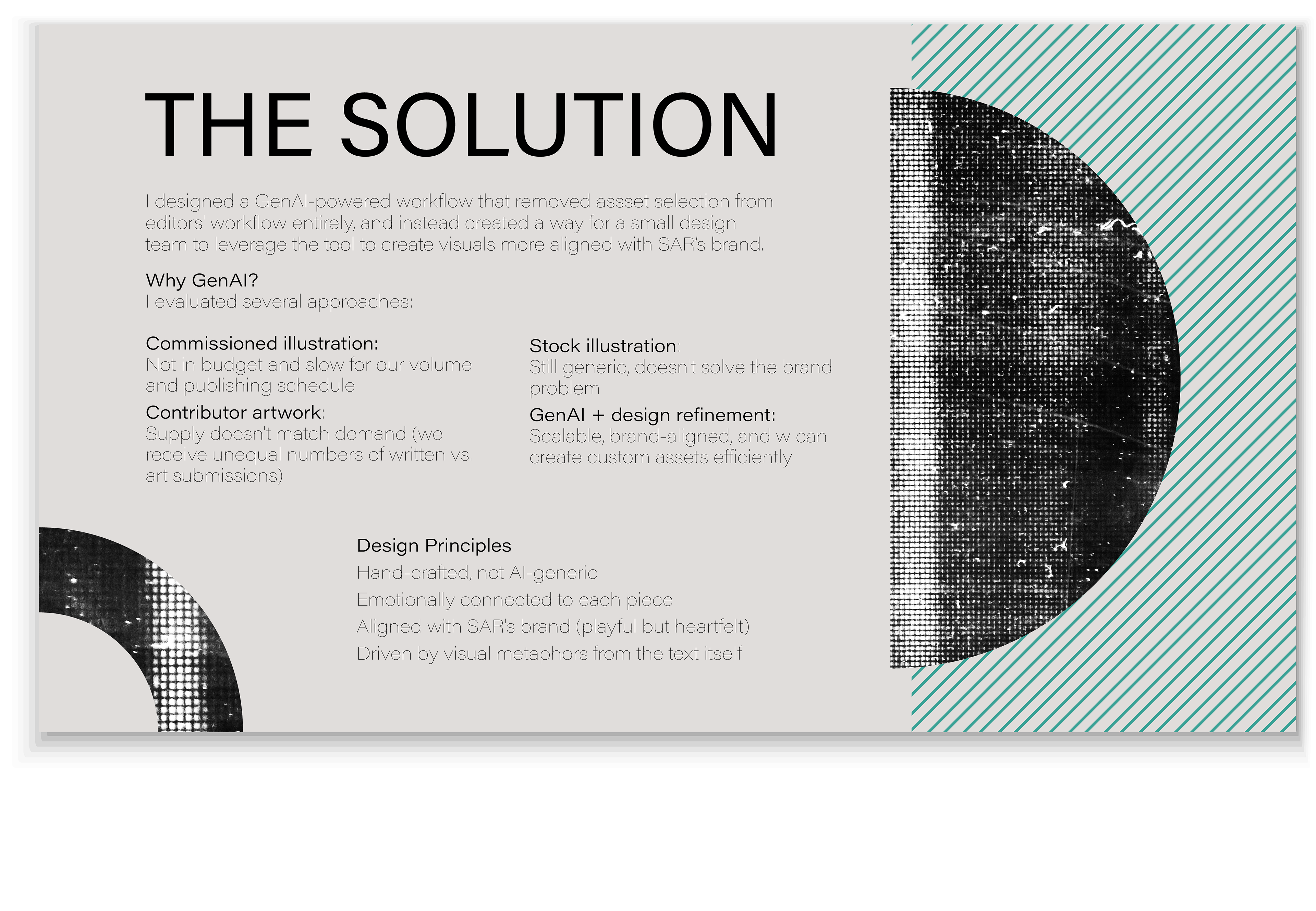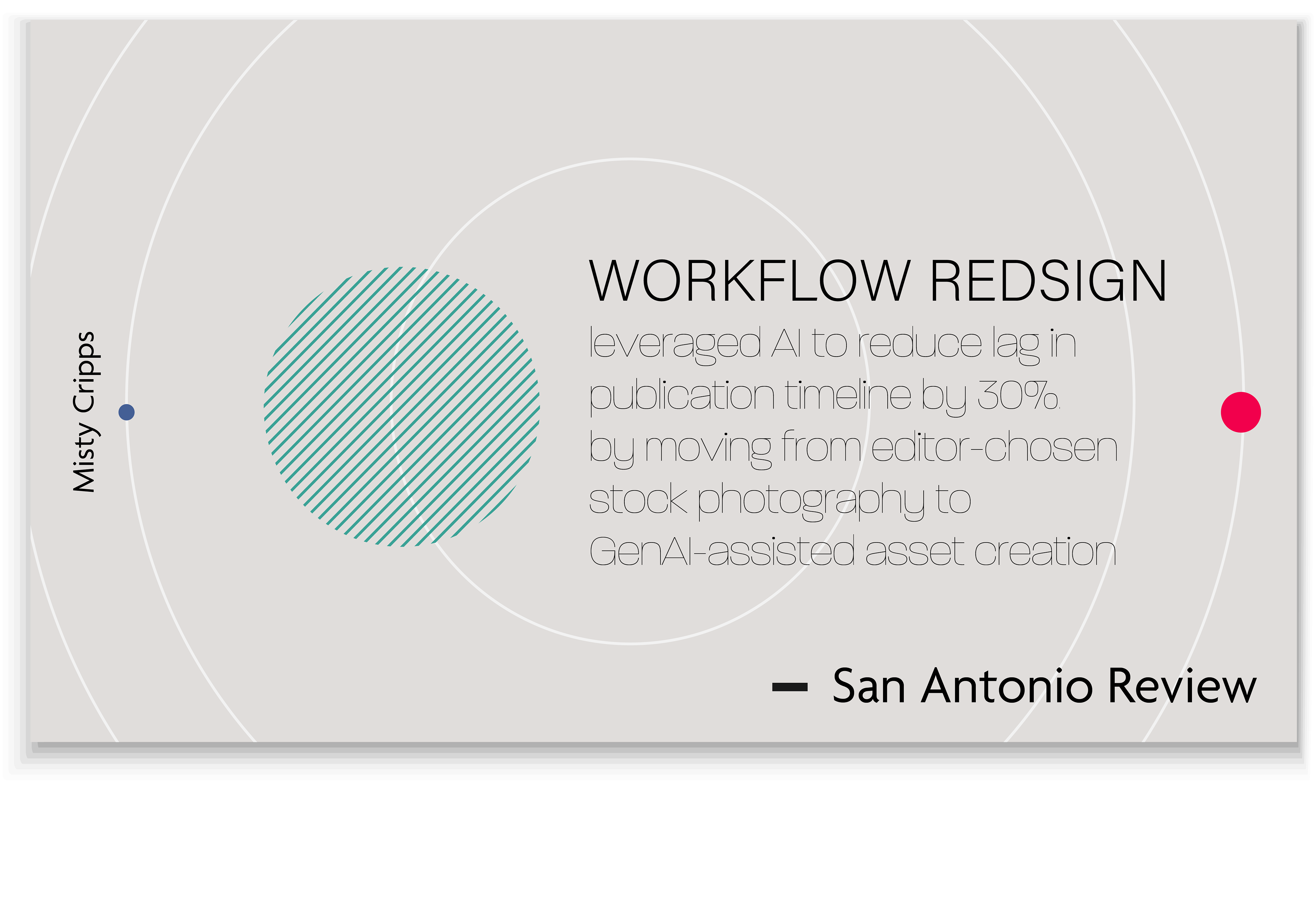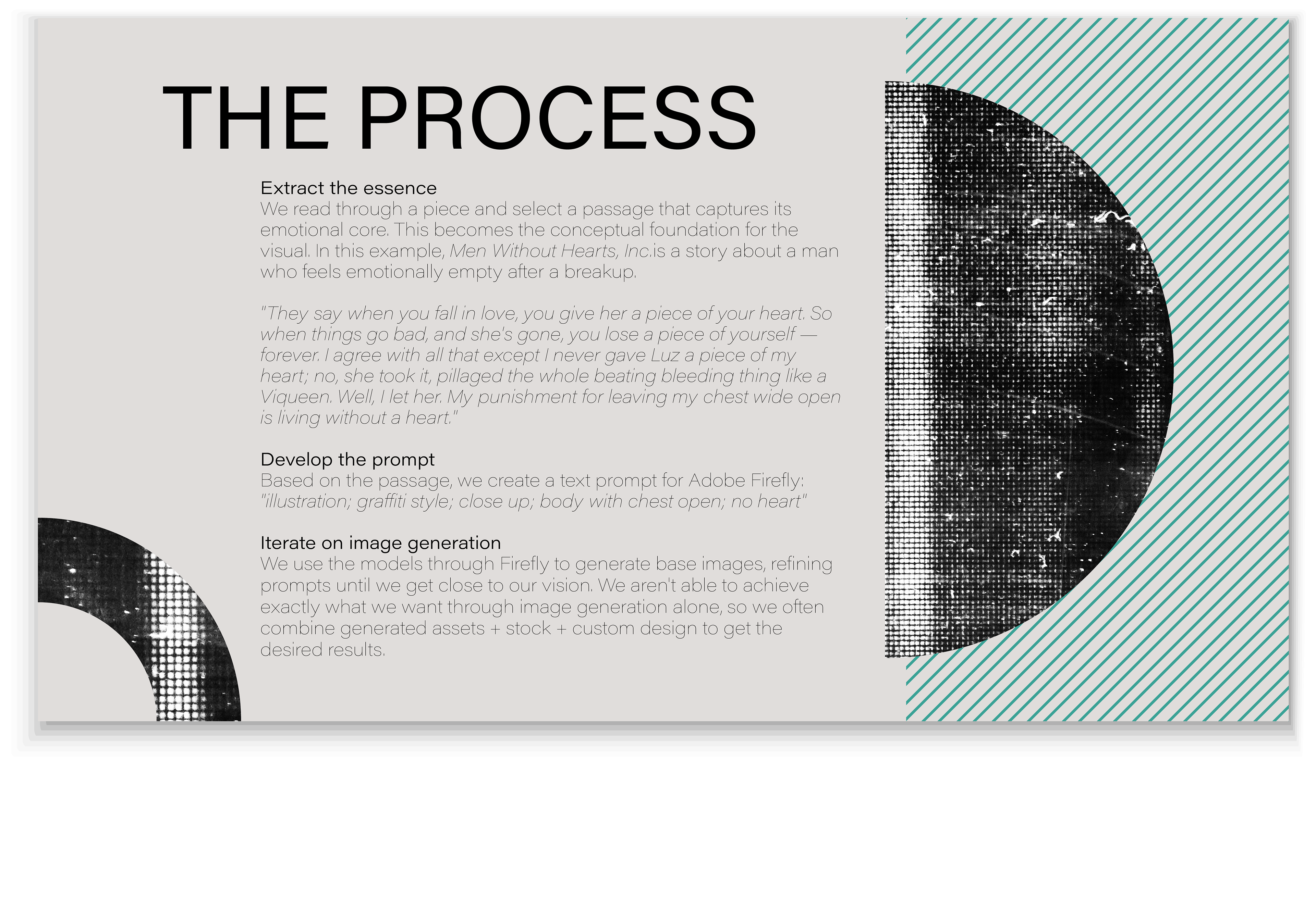 We used Photoshop to clean up the generated image and apply filers and adjustments. And that's the process. We start with an excerpt from the piece for inspiration, create a prompt, refine it until we get an acceptable base image, and edit/composit until we have a final product.