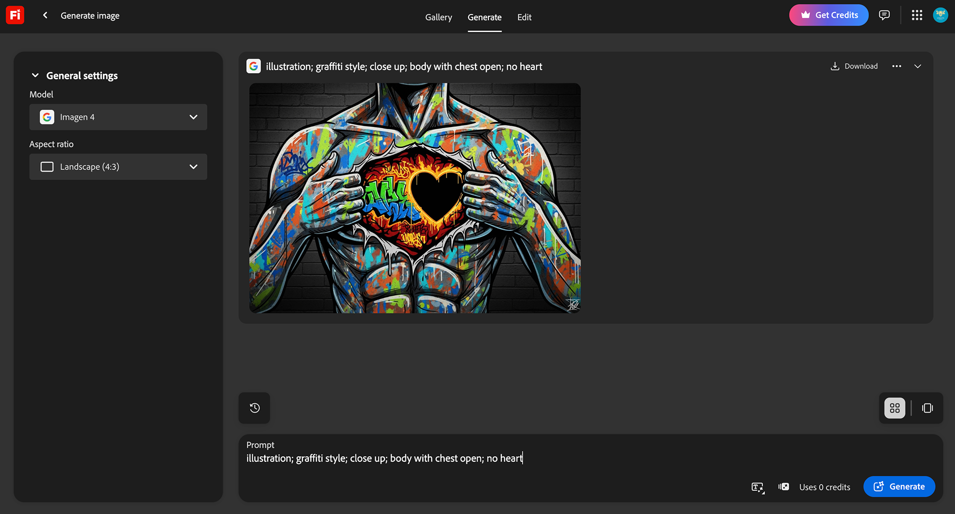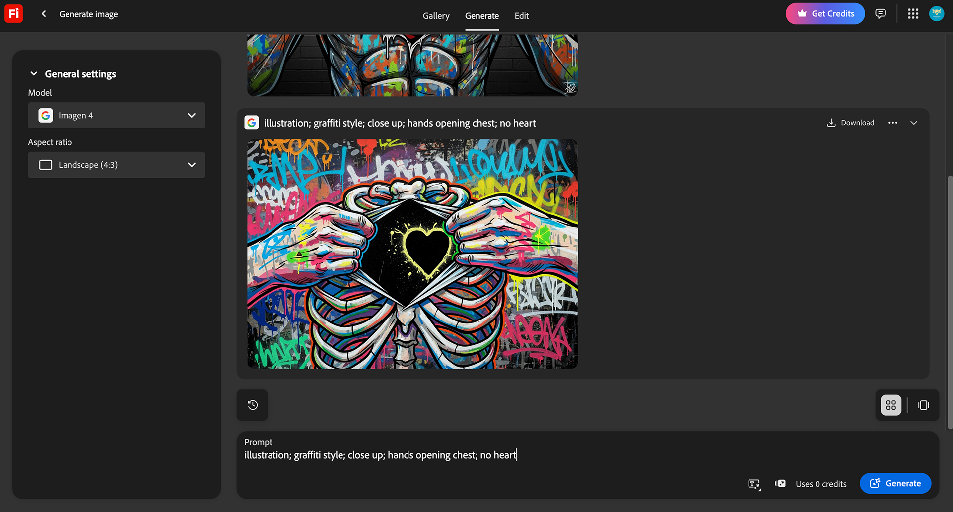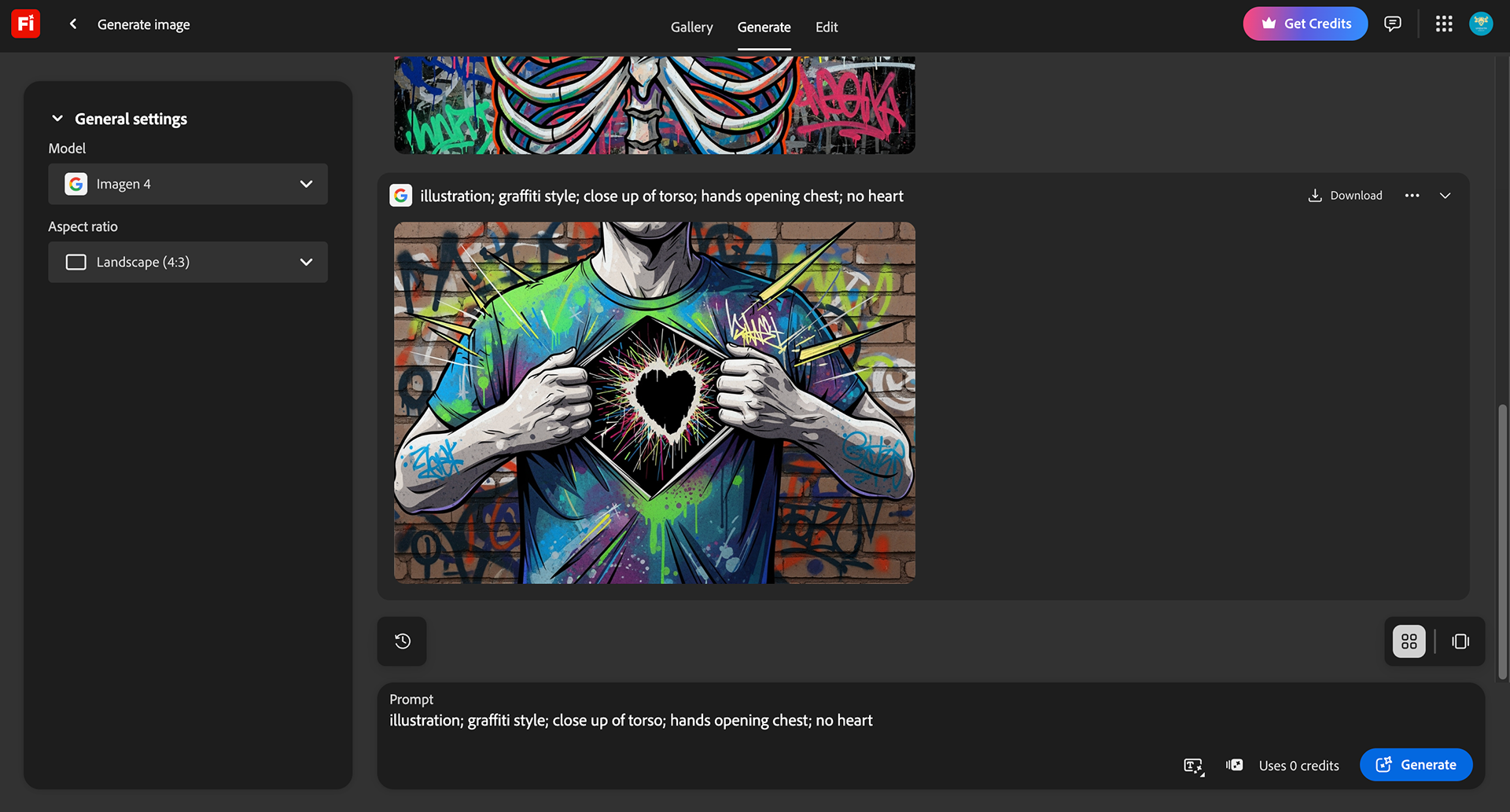 This is where we want to be. We refined the prompt to include "close up of torso". We could have been very specific and created a prompt more like "illustration; wall with spray paint graffitti; man standing in front of wall wearing t-shirt, close up of torso, hands opening chest, no heart", but this is what we were looking for. Three prompts, a base image in a few minutes. But we aren't finished yet. The image needs cleanup and other edits.